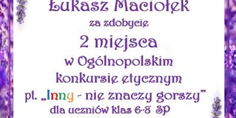 Siódmoklasista Łukasz Maciołek jest laureatem Ogólnopolskiego konkursu etycznego pt. "Inny nie znaczy gorszy".