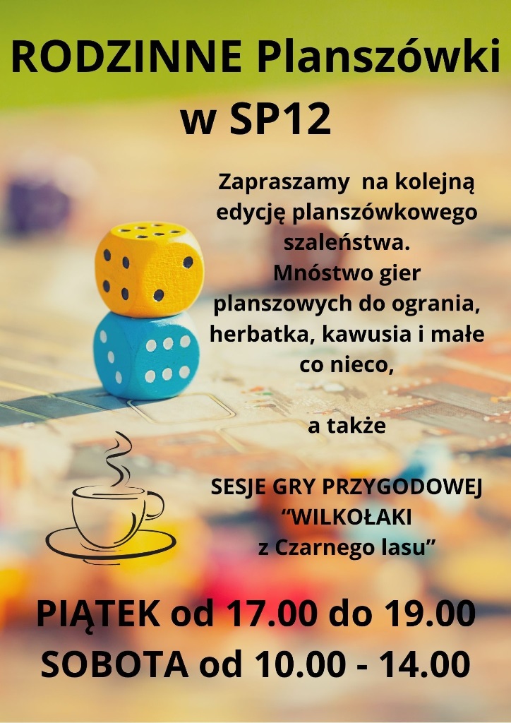 24 i 25 października zapraszamy uczniów z rodzinami na kolejną edycję Rodzinnych Planszówek w SP12.
