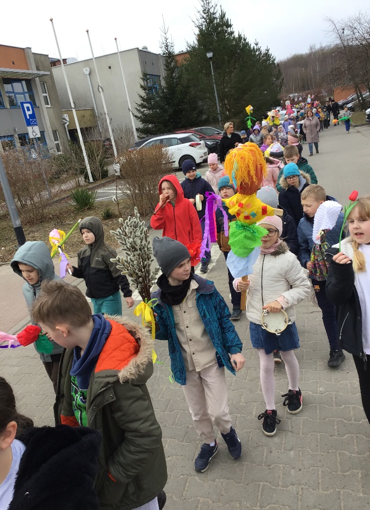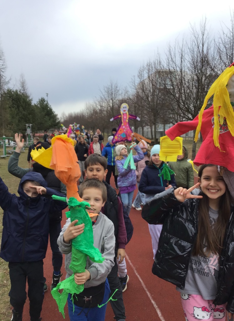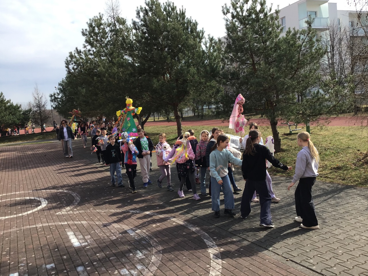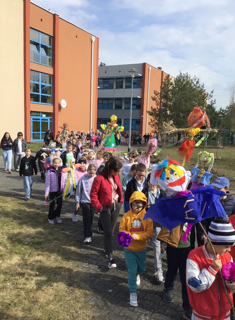 W poniedziałek 23 marca 2026r. klasy 1-3 hucznie pożegnały zimę i powitały wiosnę. Każda klasa zaprezentowała wykonane przez siebie marzanny, z którymi dzieci radośnie przemaszerowały dookoła szkoły. Przemarszowi towarzyszyły radosne okrzyki, gra na instrumentach oraz bukiety z baziek, wiosenne ptaki, kolorowe kwiaty i wstążki. Naszemu powitaniu wiosny towarzyszył również niezwykły gość - bocian, który przeleciał podczas uroczystości nad naszymi głowami.