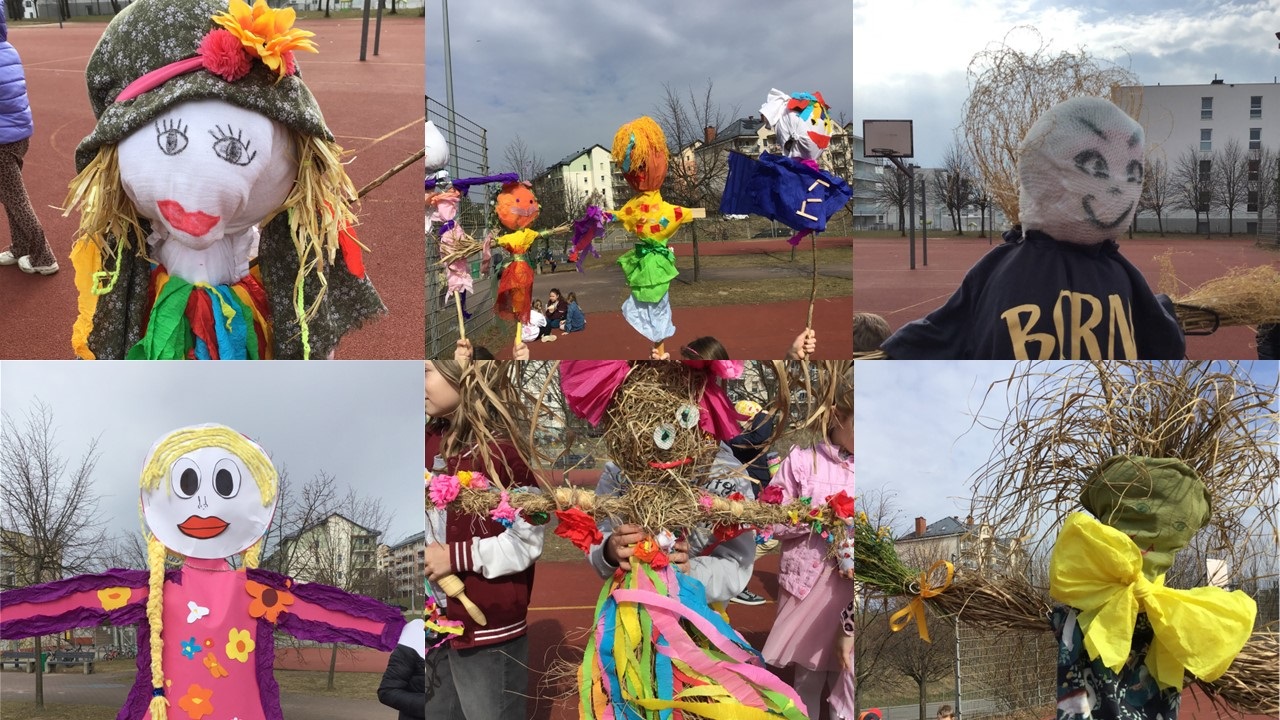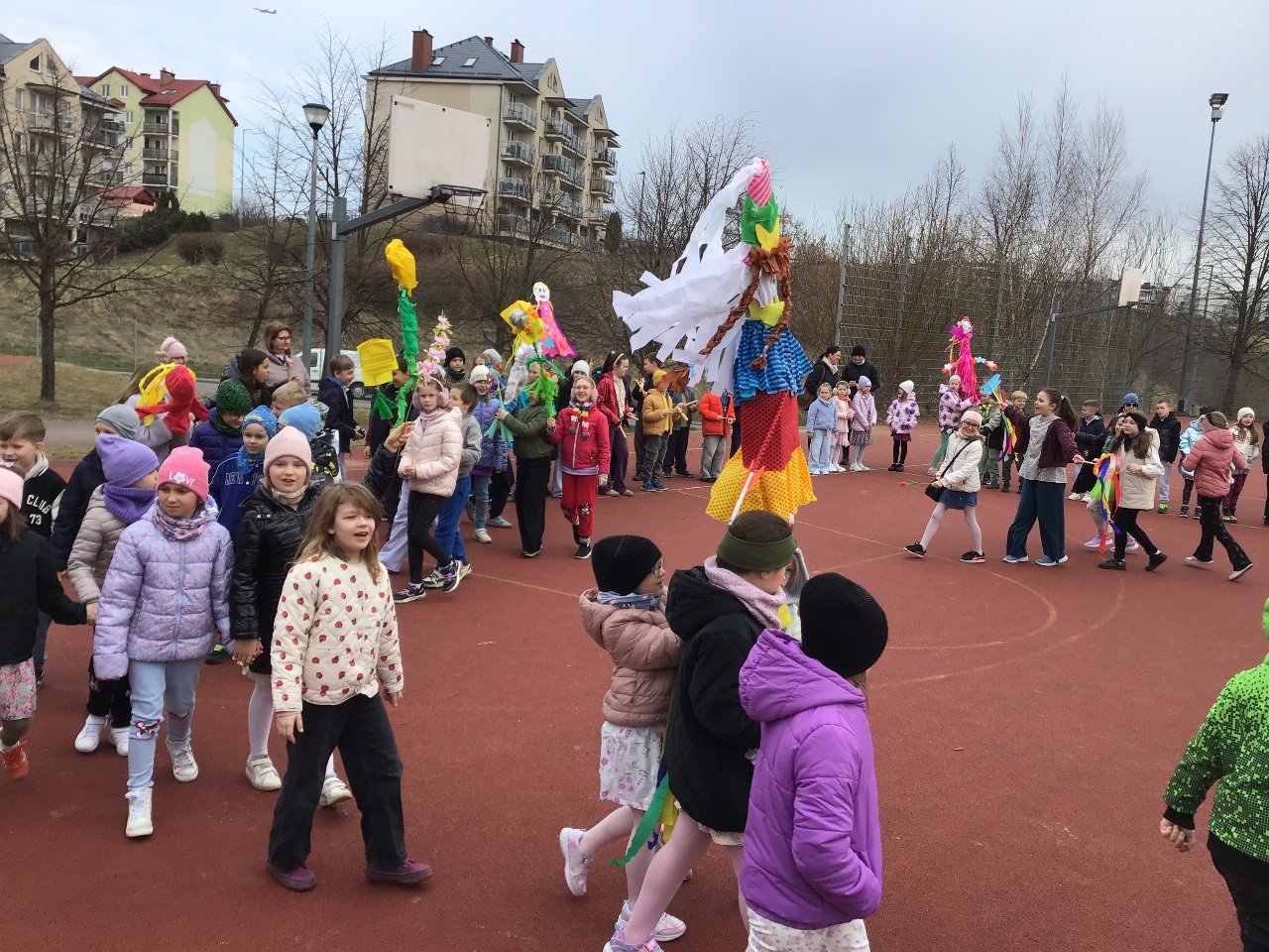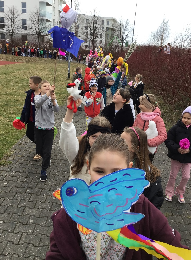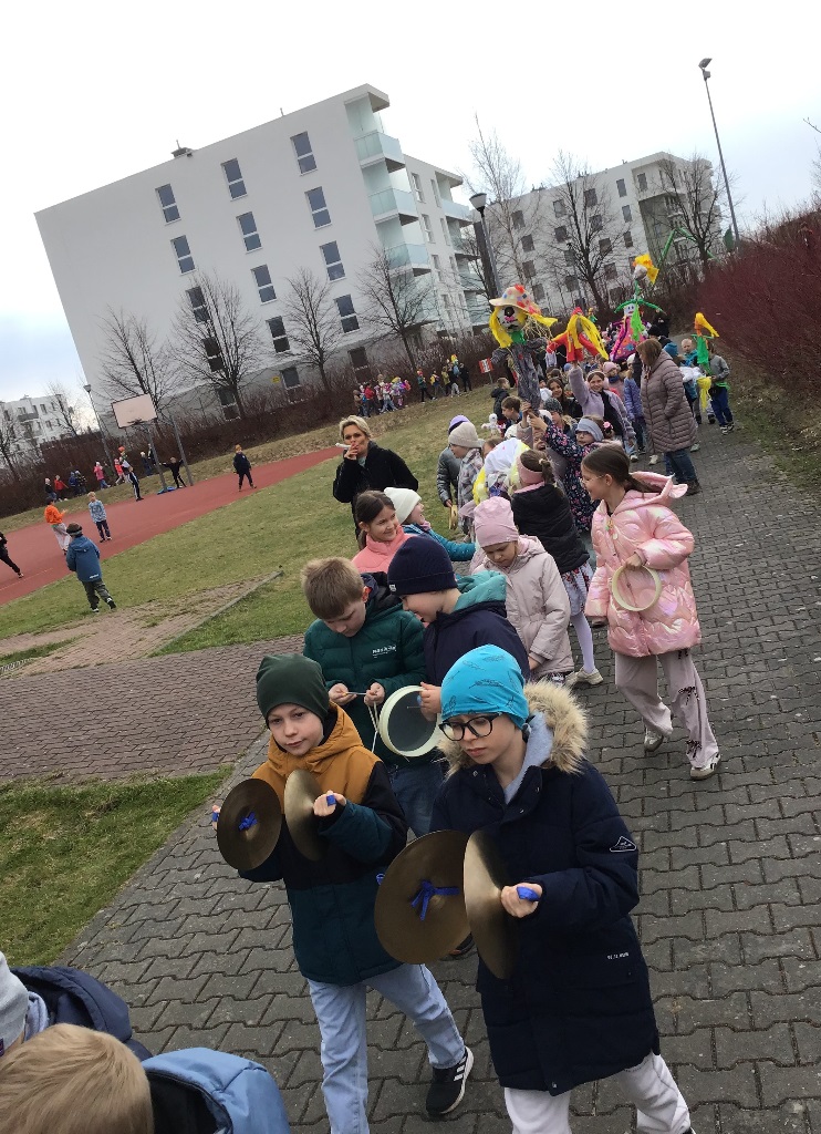 W poniedziałek 23 marca 2026r. klasy 1-3 hucznie pożegnały zimę i powitały wiosnę. Każda klasa zaprezentowała wykonane przez siebie marzanny, z którymi dzieci radośnie przemaszerowały dookoła szkoły. Przemarszowi towarzyszyły radosne okrzyki, gra na instrumentach oraz bukiety z baziek, wiosenne ptaki, kolorowe kwiaty i wstążki. Naszemu powitaniu wiosny towarzyszył również niezwykły gość - bocian, który przeleciał podczas uroczystości nad naszymi głowami.